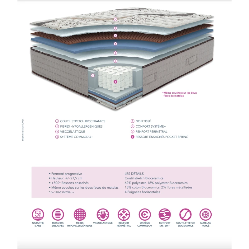La Compagnie du Blanc vous présente le matelas WELLNESS BIOCERAMIC à ressorts ensachés pour une indépendance totale de couchage. Matelas haut de gamme facile à transporter, livré sous vide. Le coutil Bioceramics vous permet de récupérer, car il augmente le flux sanguin et la vasodilatation locale et vous aide à prendre soin de vous, car il améliore l’activité cellulaire et la création de collagène