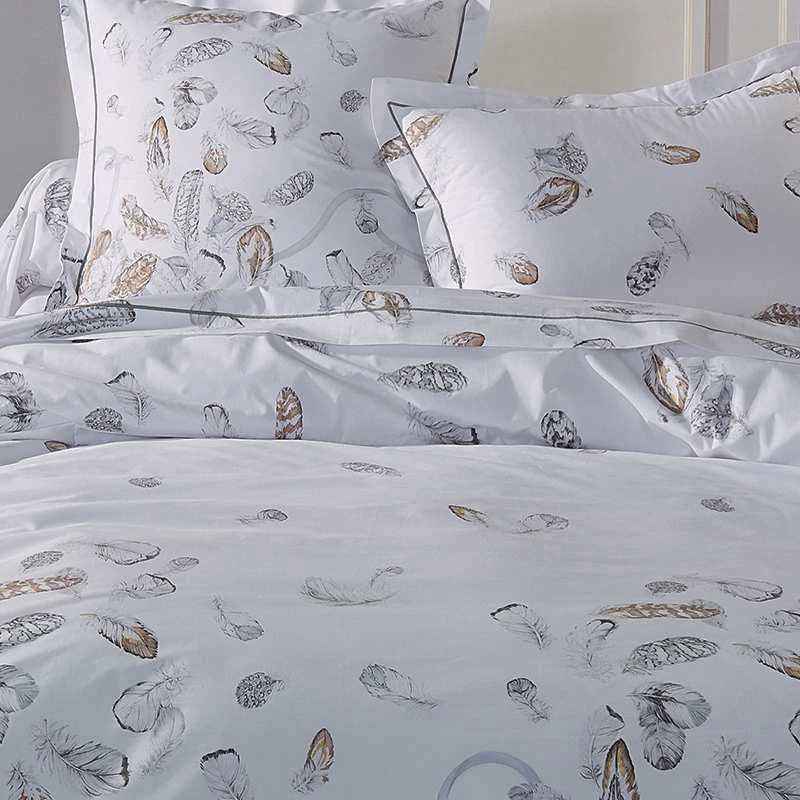 Housse de Couette à motifs plumes Percale 100% Coton 80 fils/cm2. Tissage très serré.