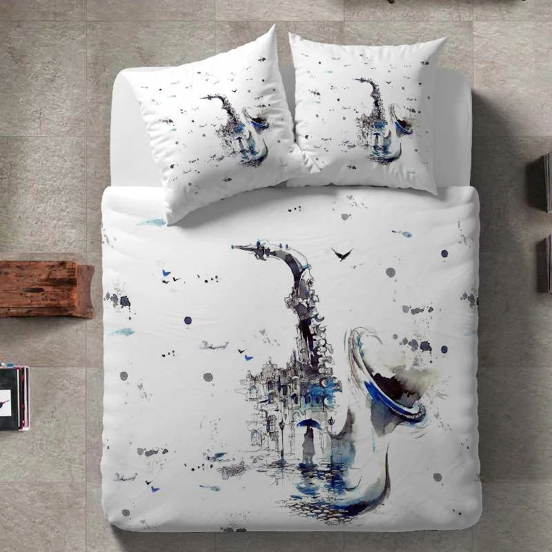 La Compagnie du Blanc vous présente la Parure Housse de couette Saxophone. Un imprimé mélangé de l’instrument et de rue donnent un ton mélancolique. Cette superbe parure est en 100% Satin de Coton.